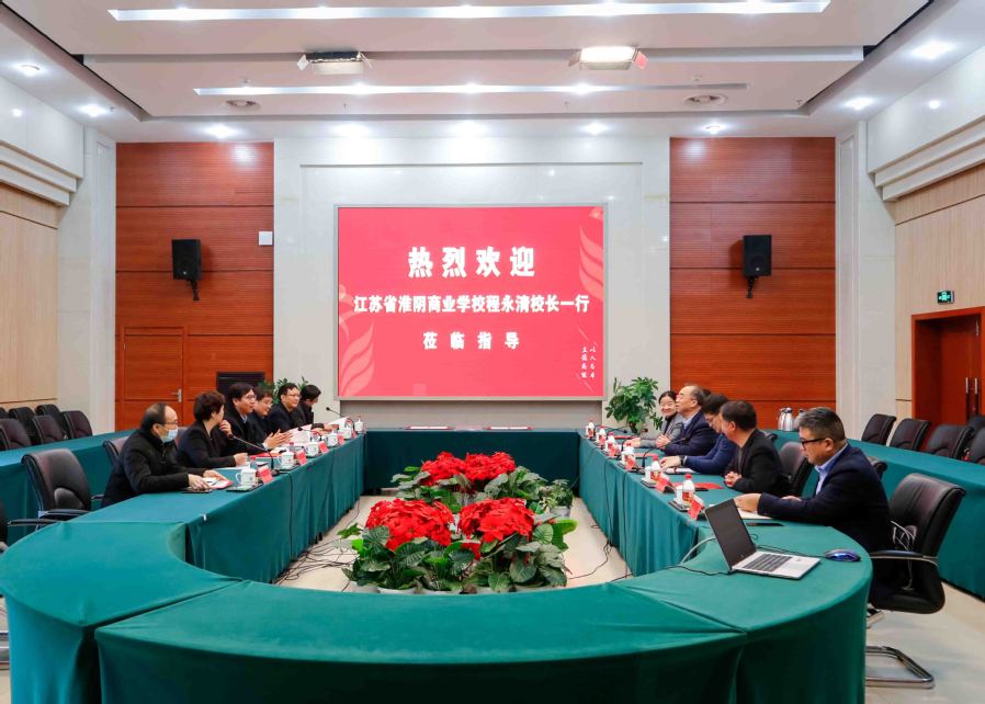 3月14日,江苏省淮阴商业学校党委书记、校长程永清一行来访好博·(中国)手机网页版洽谈共建事宜,校领导陶书中、冯锋、翟玮玮、沈艾林,党委委员周耀明、张军出席会议。