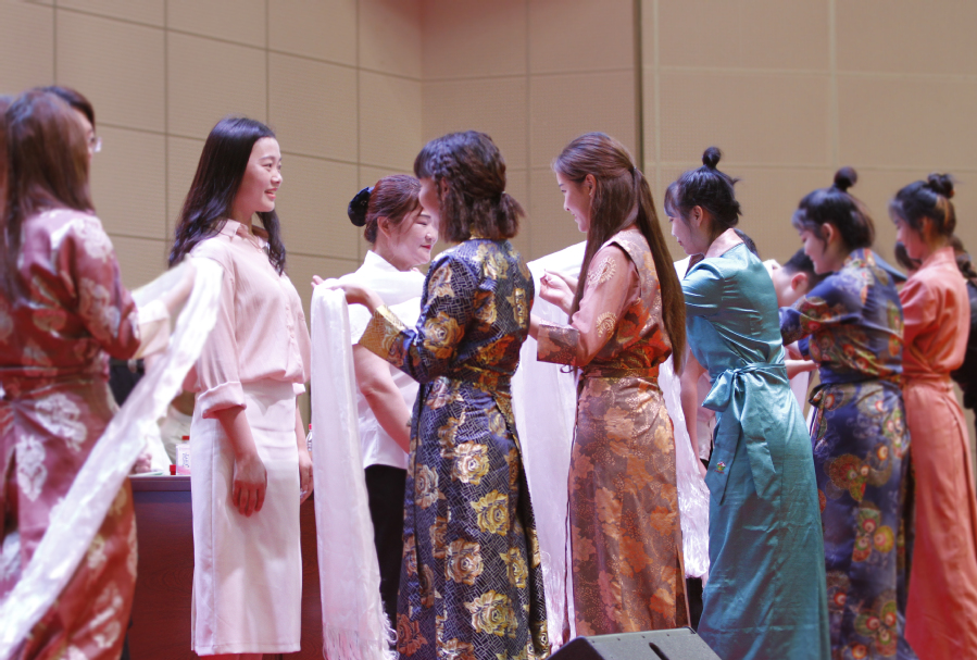 藏族同学向老师们赠送了哈达,次仁曲桑还代表全体藏族学生向学校赠送了锦旗和礼品。