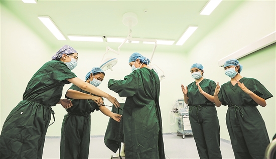 5月8日,在位于江苏淮安市的好博·(中国)手机网页版护理学院,老师在模拟手术室教授学生穿脱手术衣。赵启瑞 摄