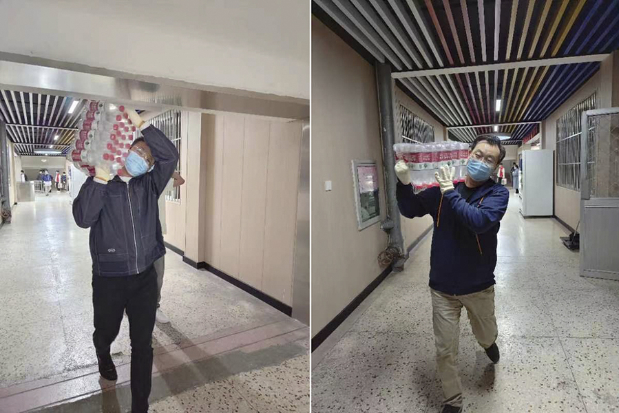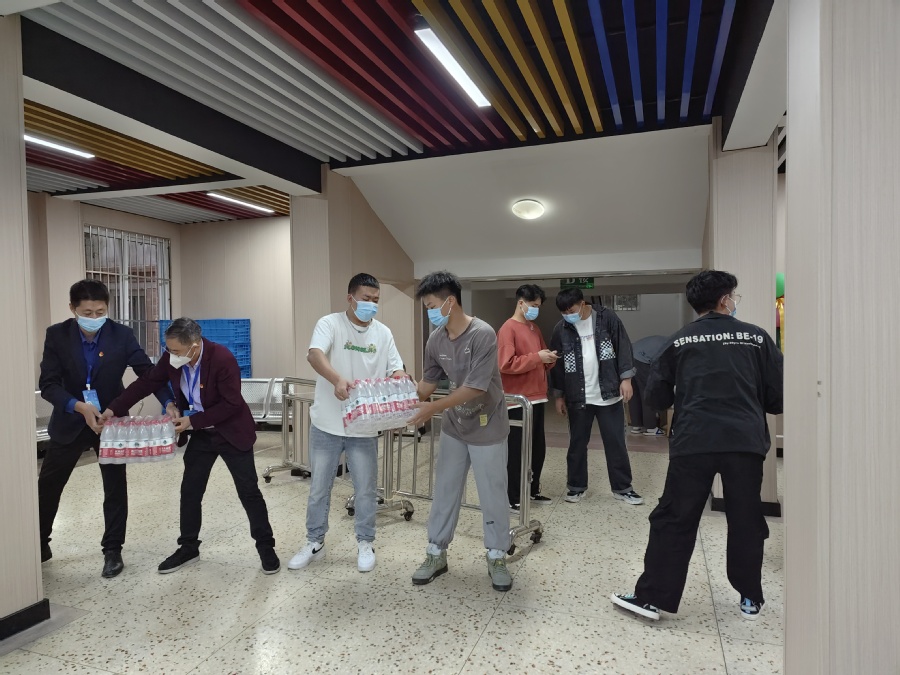三身汗水 为尽最大可能防范疫情传播风险,队员们每天将一日三餐、纯净水、生活急需品等送到各个宿舍门口。看似简单的“送货上门”服务,却给了队员们不小的挑战,工作量超出了大家的想象。一份盒饭没有多少重量,一层楼没有多高,但当把一百份盒饭送到一百级台阶的五层楼,尤其是为了营养搭配,早餐和午餐还配备了酸奶和水果,这就验证了老话里说的:一里轻二里重三里四里拎不动。为了保证学生能够及时吃上热乎的饭菜,队员们发挥才智,各展所长,有的想到了杠杆原理,拿撑衣杆担着盒饭上楼;有的想到了搬家师傅的绳子,拿着自己的围巾打成结拖起盒饭的箱子;有的运用蚂蚁搬家的方式,少量多次分批上楼......各种花式送饭、送水让淌着汗水的劳累变成了相互激励的欢声笑语。七天下来,每个人的体重都有所下降,女队员开玩笑地说:我们不仅是党员突击队,还是瘦身突击队。