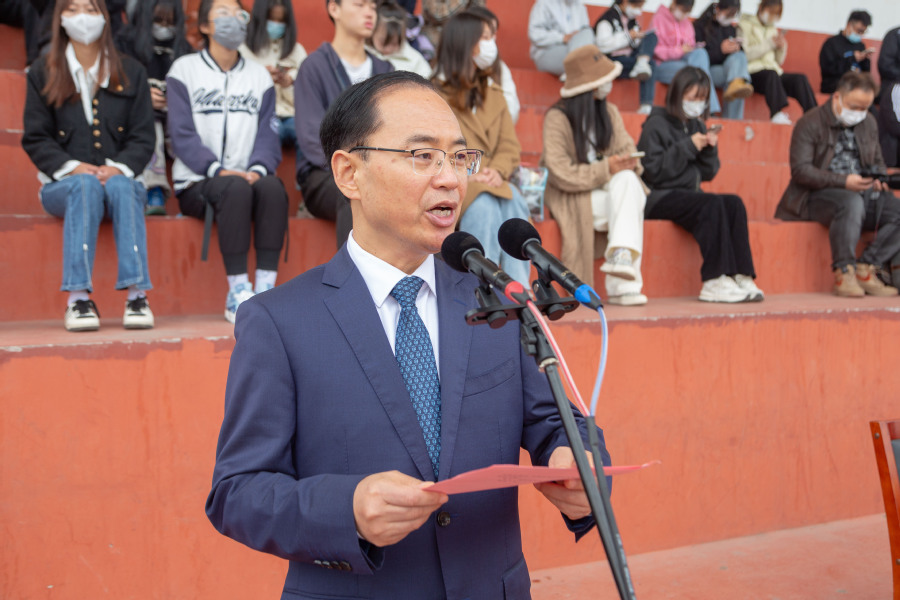 校长薛宇致辞。他指出,体育是青春的底色,奋斗是青春的本质。每年一度的运动会,是对同学们身体素质和竞技水平的集中检阅,更是对全体师生体育精神和精神面貌的集中展示。希望大家充分发挥奥林匹克精神,顽强拼搏,勇于攻坚克难,尊重对手、尊重裁判、尊重观众,赛出成绩,赛出水平,赛出风格,以坚韧执着书写青春的风采,去创造运动场上的辉煌和传奇。