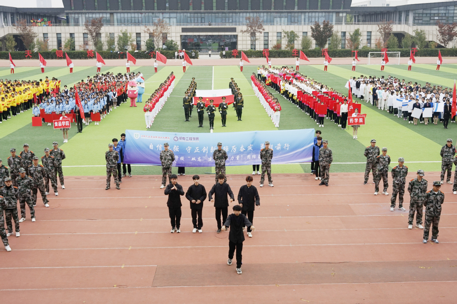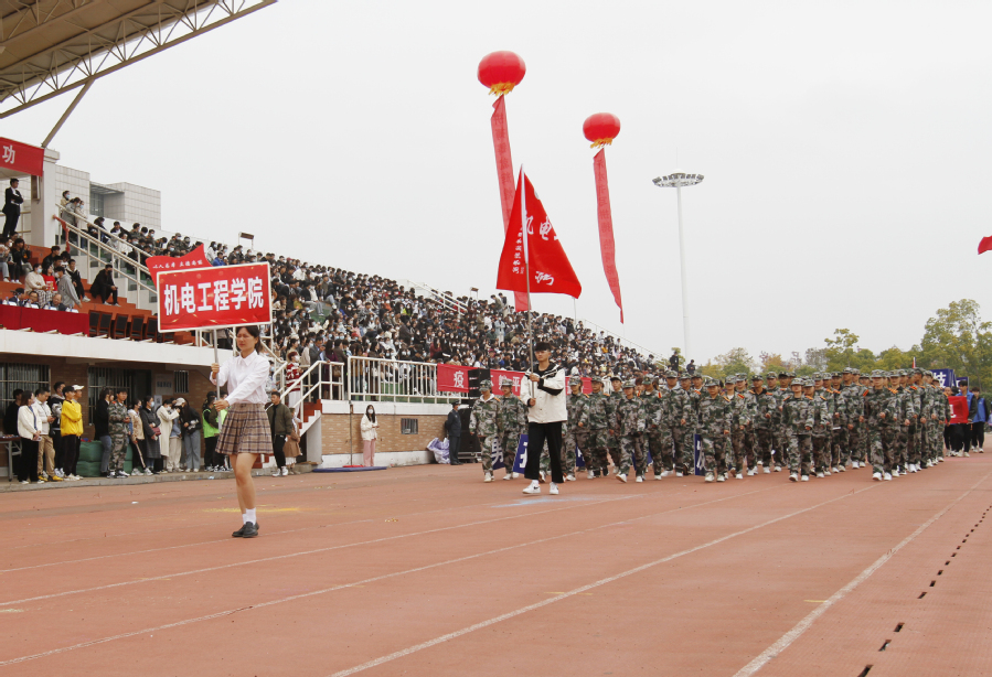▲机电工程学院代表队踏着青春的旋律,迈着矫健的步伐,整齐自信、英姿飒爽地向主席台走来。他们用武术和军体拳,展现“机电学子”的青春风采。