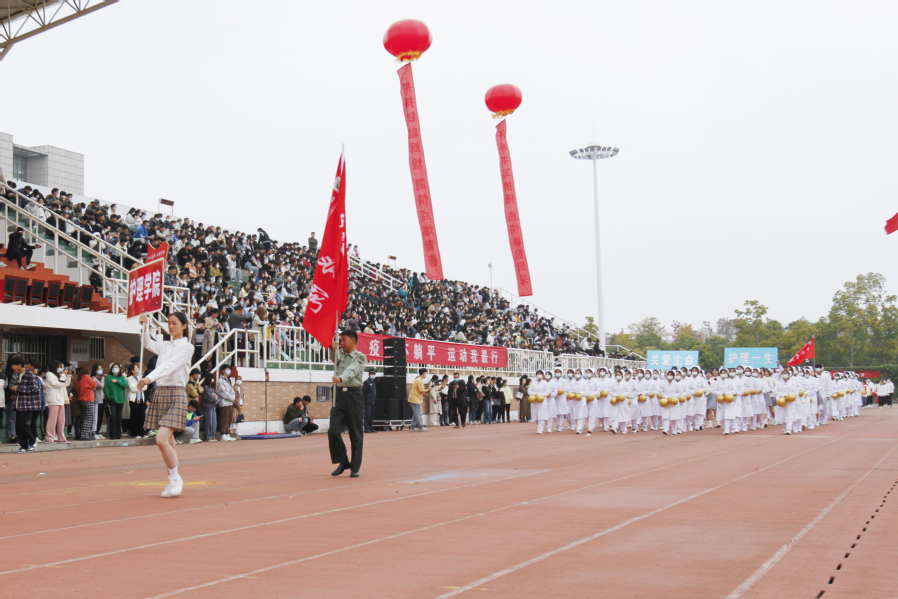 ▲他们以心为灯,愿作生命的守护天使。他们以梦为马,坚守厚德仁爱的医护初心。护理学院代表队身穿整齐的医护服装,用青春的舞姿、自信的笑容展示着白衣天使的精神风貌。