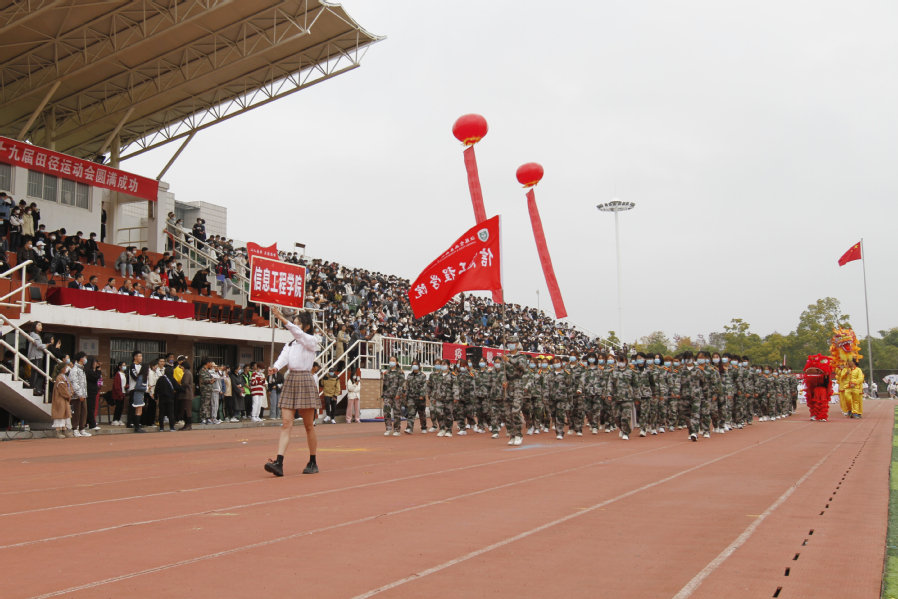 ▲信息工程学院代表队两头雄狮、双狮合一,锦色长龙紧随其后,在会场上腾跃、起舞,尽显阳刚之风。14名少女手持花球,步履轻盈,散发着青春的芬芳。