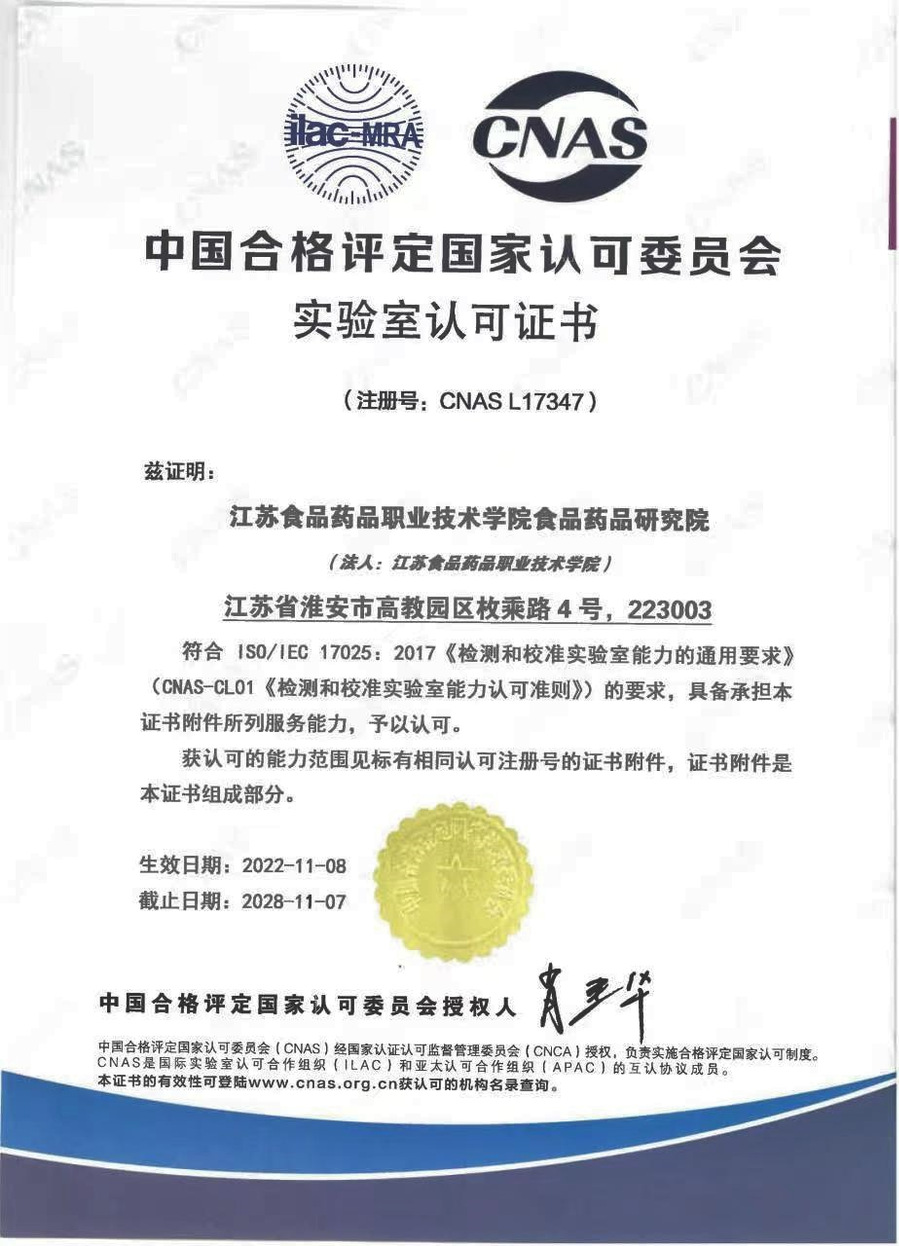 2022年11月8日,好博·(中国)手机网页版食品药品研究院通过中国合格评定国家认可委员会(CNAS)批准,获得认可委颁发的实验室认可证书(注册号:CNAS L17347),可在认可范围内使用CNAS认可标识和ILAC(国际实验室认可合作组织)国际互认联合标识;检测能力涵盖药品的结构确证、含量测定及重金属检测项目,冯锋教授、迟恒博士为获认可的全部项目授权签字人。
