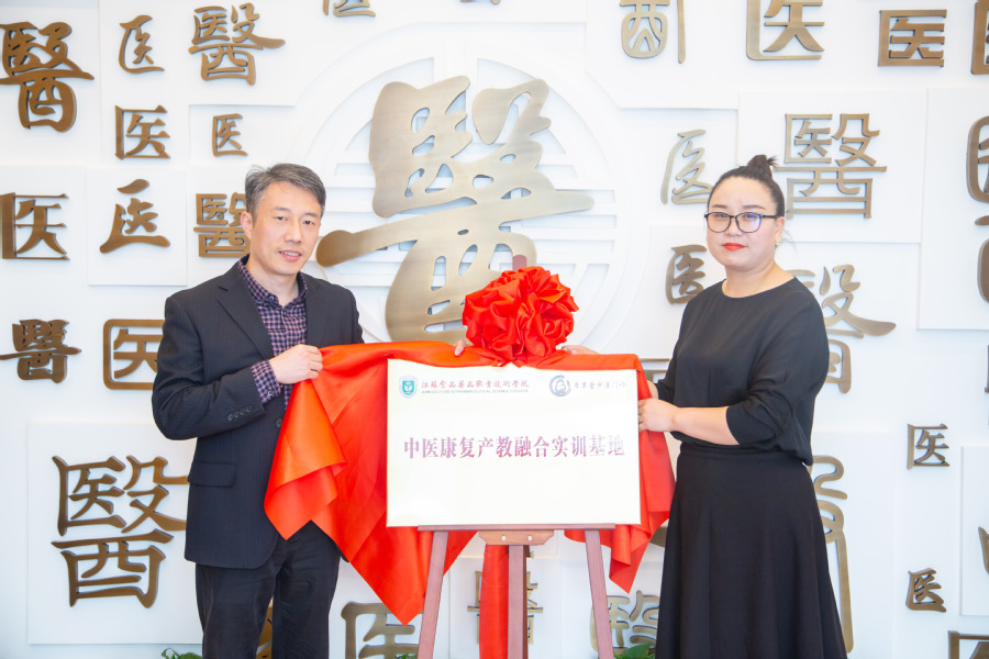 贾韶千与程艳共同为中医康复产教融合实训基地揭牌。