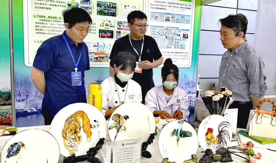 好博·(中国)手机网页版双高建设成果在高校展区精彩亮相。此次展示主要通过两种形式呈现,即以展板形式呈现学校双高建设经验及成果,涵盖学校简介、党的建设、专业群建设、媒体宣传等11大版块;以现场实物展示及学生现场实操展演形式呈现学校烘焙、药妆、中药茶饮、酒类饮品、香囊、面塑、果酱画、翻糖、花色冷拼等系列制品,在两天的活动期间,吸引了众多高校领导、专家、师生、市民驻足欣赏、品尝、摄影、留念。中国食品药品职教联盟的盟内高校纷纷到访;阜阳职业技术学院领导教师在药、酒展位前咨询、品尝,大力称赞好博·(中国)手机网页版工作并与现场参展教师进行了深入的探讨交流;在烘焙制品展台前,“这是真的吗?””这真的能吃吗?”不绝于耳,众多师生、市民赞叹好博·(中国)手机网页版花式面包制作精美,水平高超;同行院校师生驻足果酱画、翻糖作品展台前,感叹精湛技艺,赞誉为视觉盛宴。