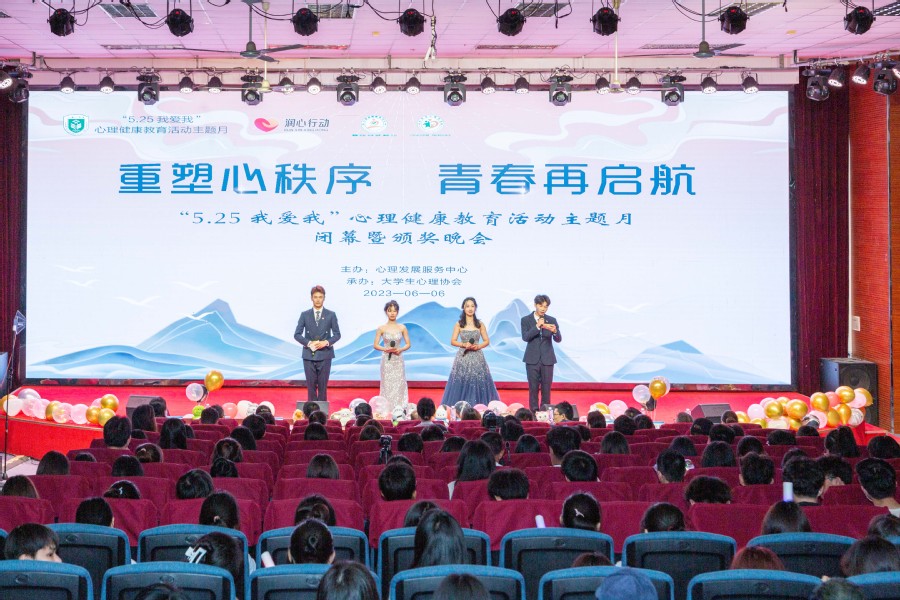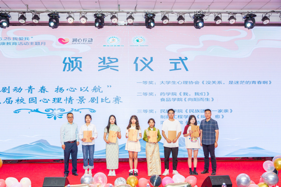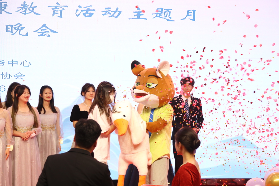晚会还穿插了颁奖环节及抽奖环节。出席活动的领导们为“灵动指尖 心序可安”第六届校园手语操比赛和“剧动青春 扬心以航”第五届校园心理情景剧比赛一二三等奖学生代表及优秀指导老师、“5.25我爱我”心理健康教育活动主题月优秀活动组织老师与2022-2023年学生心理健康教育工作优秀心理辅导员进行了现场颁奖。现场12名幸运的同学获得了晚会准备的丰厚礼品。