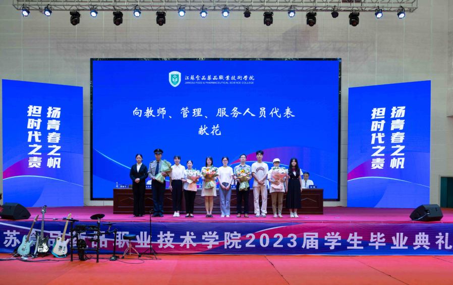 学生代表为教师、管理、服务人员代表献花,表达感恩与敬意。