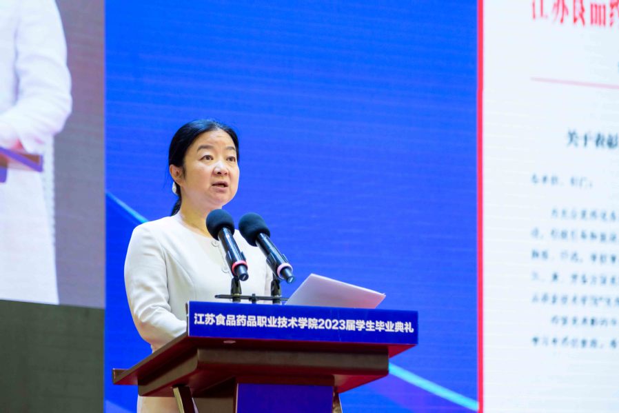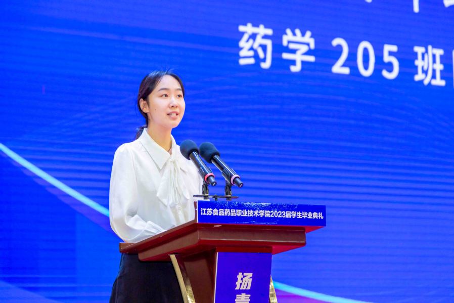 2023届毕业生代表药学205班的陈斯雯说:“2023年的盛夏,我们收获了累累硕果,向三年的大学生活交出了答卷。”她表示三年的美好生活将会永远珍藏在脑海中,未来的道路遥远而漫长,希望每一位毕业生都能不惧险阻,逐梦青春、勇攀高峰。
