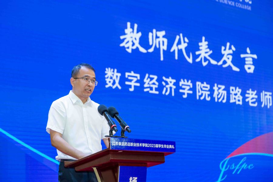 数字经济学院教师杨路作为教师代表发言,他祝福毕业生们守好“追梦赤子心” ,既要冲破内卷,不甘躺平,也要学会自我安慰、自我开导、自我和解,拥抱美好未来。