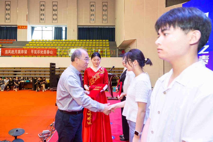 党委书记陶书中为省级优秀毕业生代表和技能标兵代表颁发荣誉证书,勉励他们在未来的工作生活中坚定理想信念、牢记初心使命,在干事创业中开拓人生。