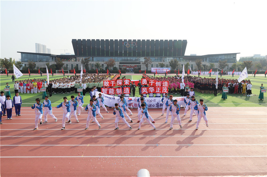 智能制造代表队踏着青春的旋律,整齐自信、英姿飒爽地向主席台走来。他们用武术和军体拳,展现“智院人”的青春风采。