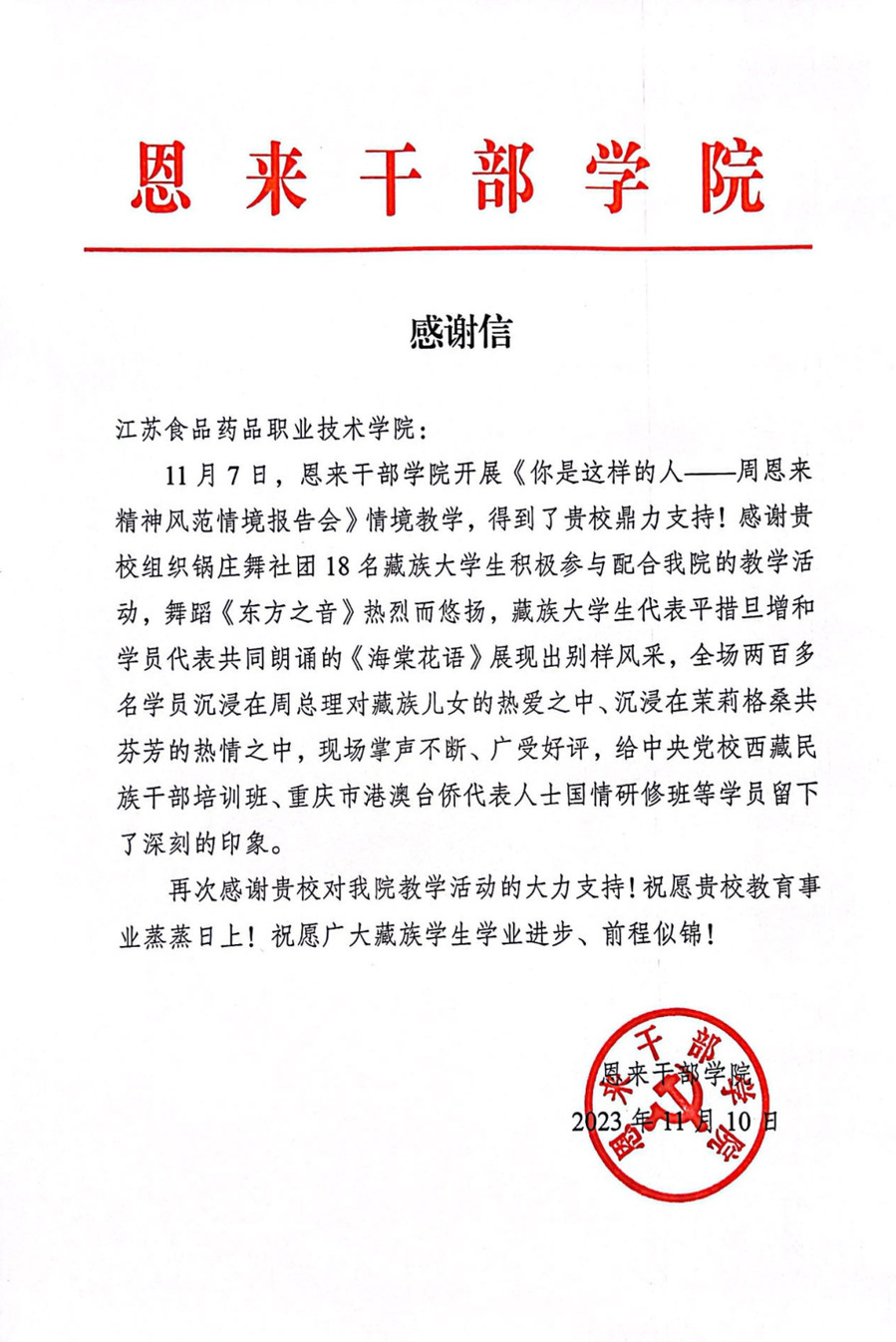 近日,恩来干部学院给好博·(中国)手机网页版发来感谢信,对好博·(中国)手机网页版组织锅庄舞社团18名藏族大学生积极参加恩来干部学院教学活动表示感谢。全文如下: