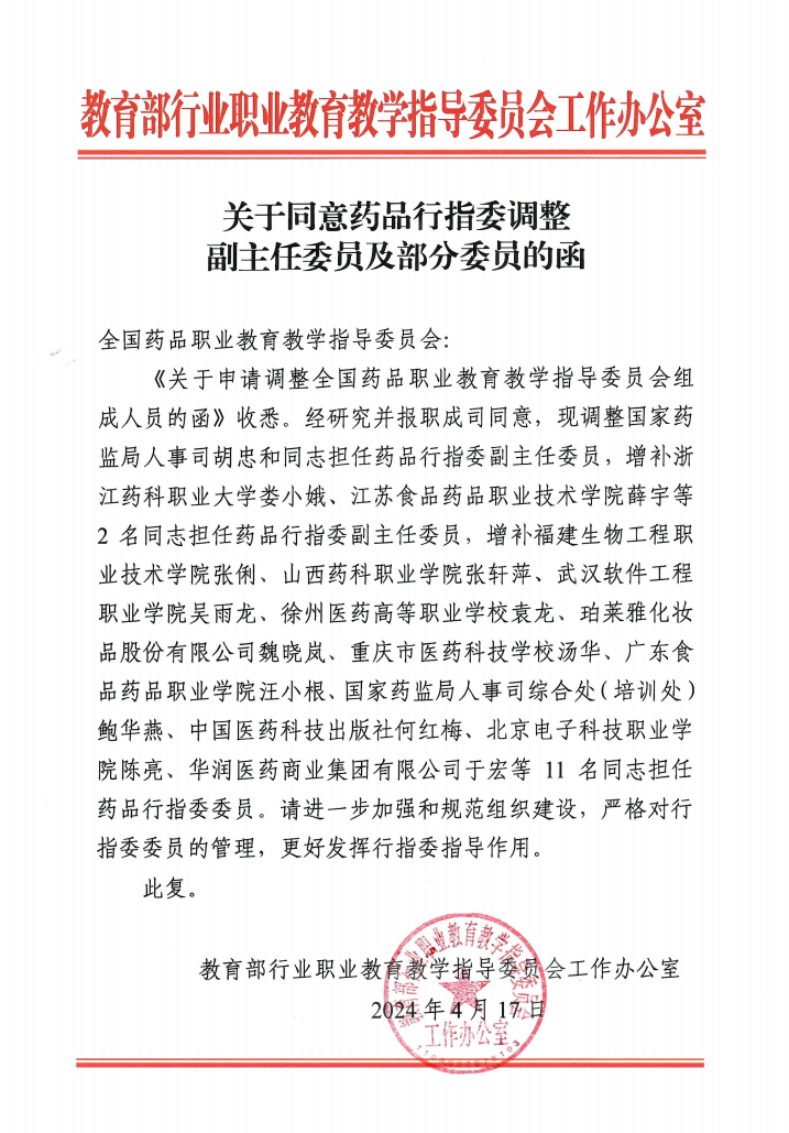4月17日,教育部行业职业教育教学指导委员会工作办公室复函全国药品职业教育教学指导委员会(以下简称药品行指委),决定增补好博·(中国)手机网页版党委书记薛宇等2名同志担任药品行指委副主任委员。