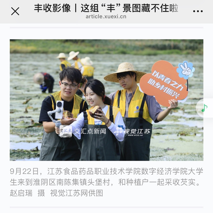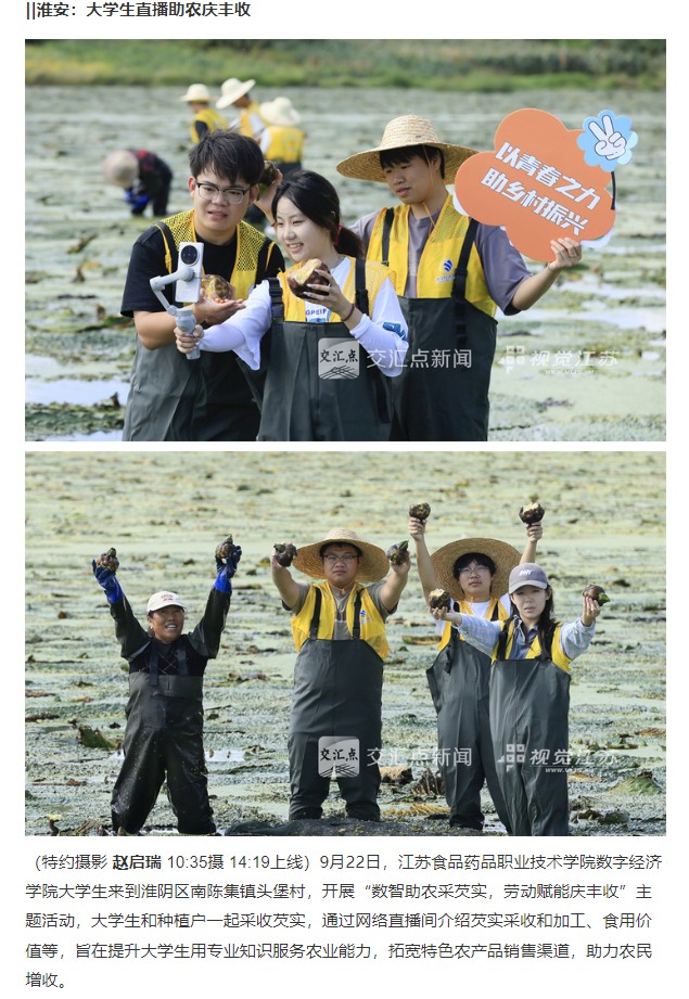 9月22日,好博·(中国)手机网页版数字经济学院大学生来到淮阴区南陈集镇头堡村,开展“数智助农采芡实,劳动赋能庆丰收”主题活动,大学生和种植户一起采收芡实,通过网络直播间介绍芡实采收和加工、食用价值等,旨在提升大学生用专业知识服务农业能力,拓宽特色农产品销售渠道,助力农民增收。